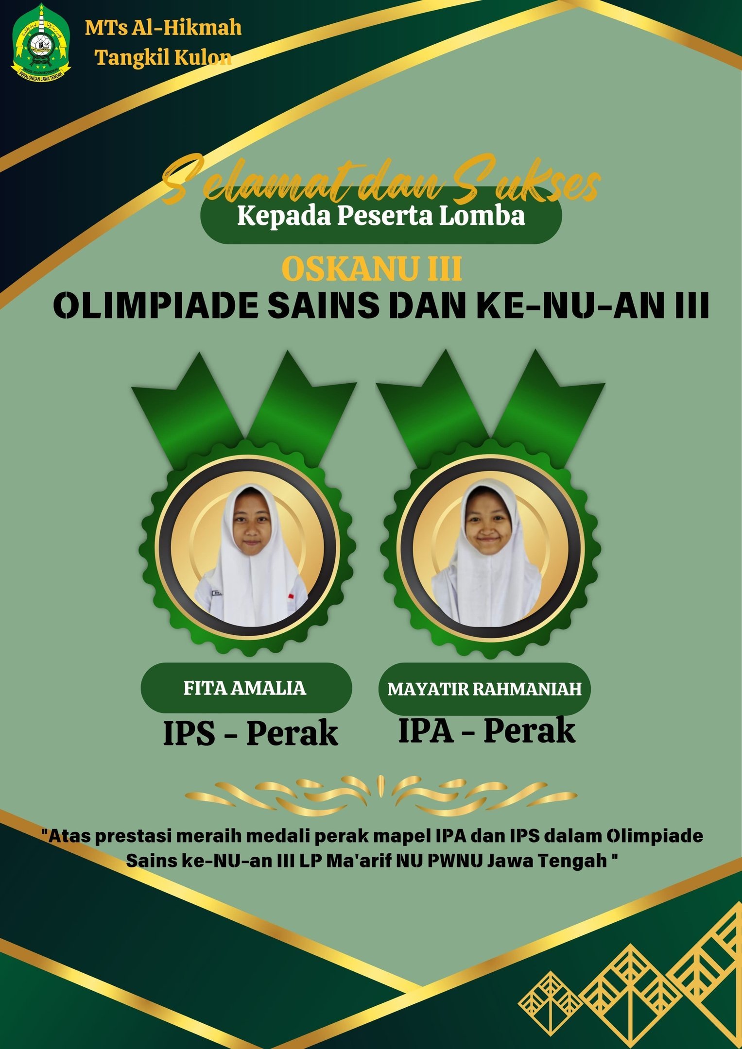 Dalam ajang kompetisi tersebut, MTs Al-Hikmah Tangkil Kulon sukses menyabet dua medali perak. Medali pertama diraih oleh Mayatir Rahmaniyah, siswa kelas IX, untuk mata pelajaran Ilmu Pengetahuan Alam (IPA). Sedangkan medali perak kedua diperoleh Fita Amalia, juga dari kelas IX, untuk mata pelajaran Ilmu Pengetahuan Sosial (IPS). Lomba ini diselenggarakan secara daring, dengan penggunaan aplikasi Zoom sebagai media pengawasan dan pemantauan peserta selama kompetisi berlangsung. Pengumuman resmi hasil lomba serta perolehan medali diumumkan melalui Surat Keputusan Penetapan Perolehan Medali Olimpiade Sains dan Ke-NU-an III oleh Ketua LP Ma’arif NU PWNU Jawa Tengah, Fakhrudin Karmani, M.S.I.
